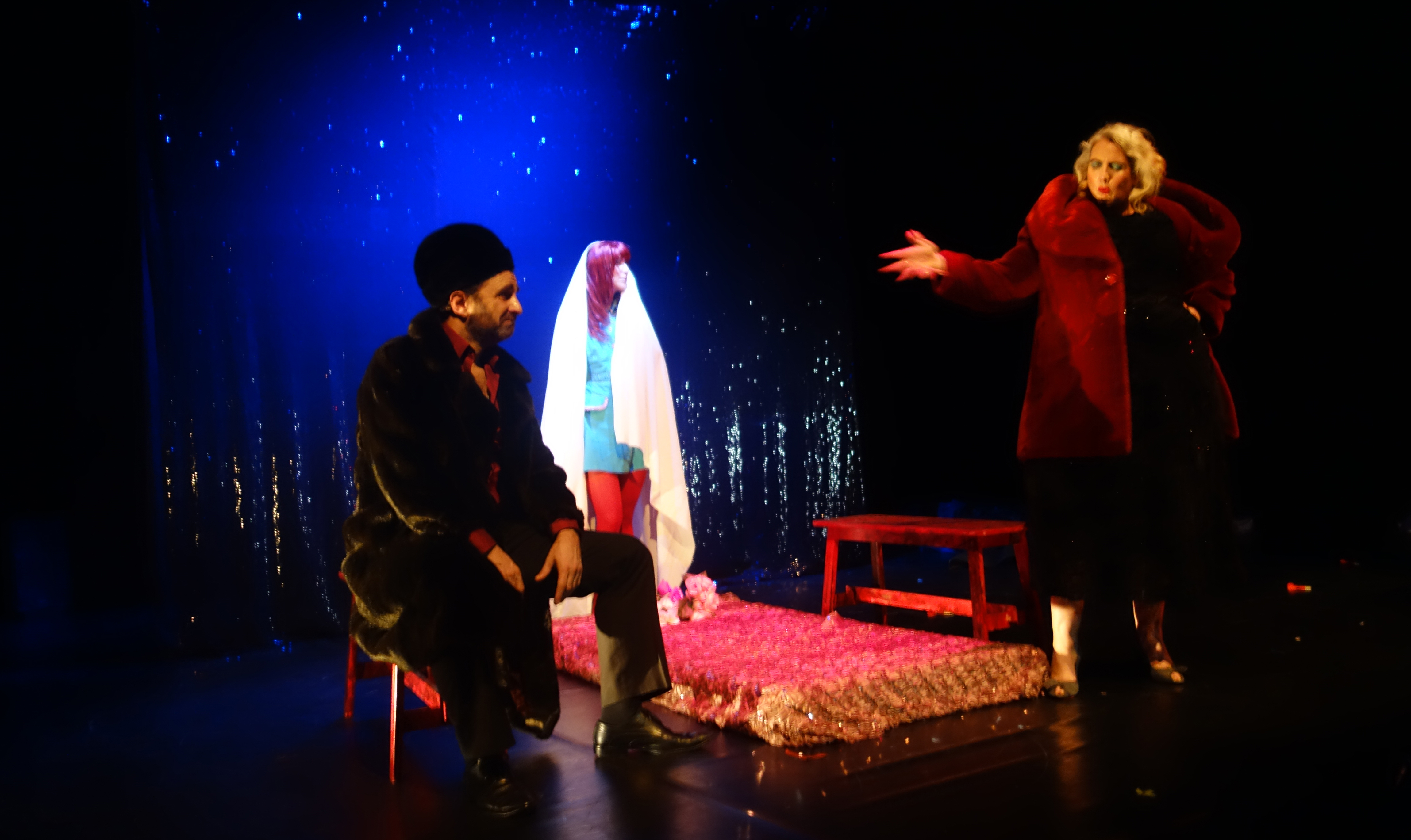 Quatre comédiens pour une fable grinçante : Yves Buchin joue L’homme du train et Le père | Christelle Jacquaz joue Zozo | Frédéric Jeannot joue Le contrôleur et Lui | Olivia Machon joue La dame du train et La mère.